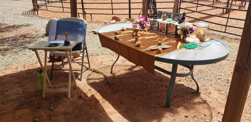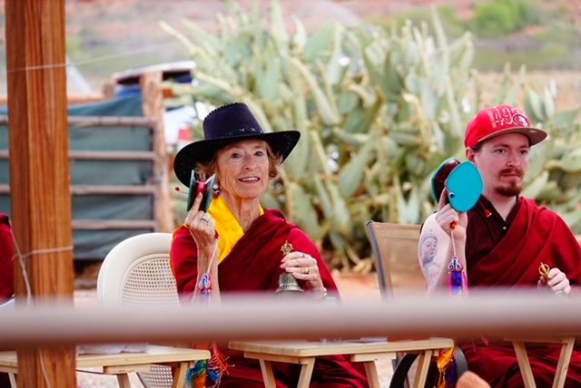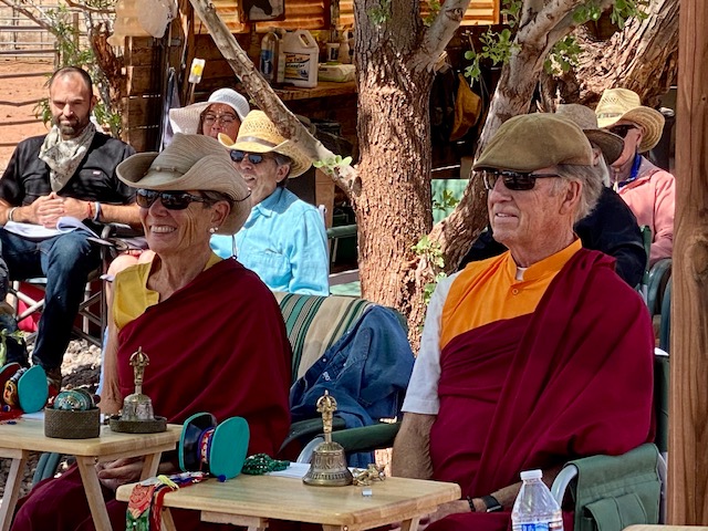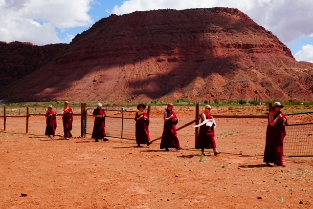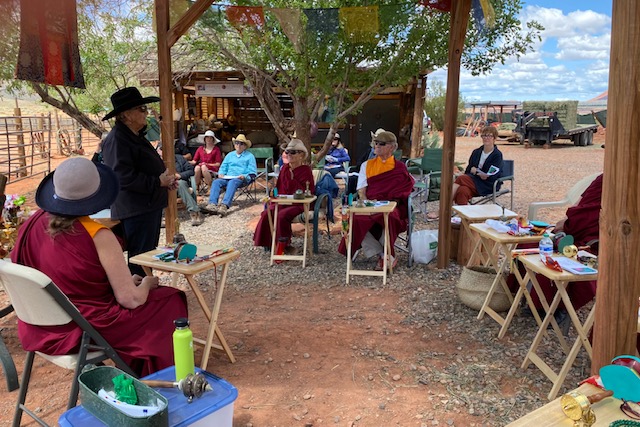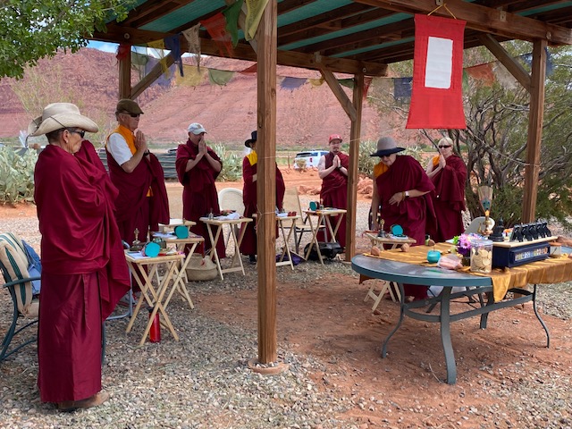 Recently, our sangha was invited to bless the “home” of the wild mustangs of Windhorse Relations. We had never been asked to bless a house before, and so this was a beautiful beginning, and a time when Tahri Marpo Ling and Windhorse Relations forged a new relationship. A herd of wild mustangs lives on the outskirts of Kayenta. The program of helping people learn from these majestic beings was founded by Mary Lee Brighton, and co-founded by Marcia Thayne. Please go to their website: windhorserelations.org to “meet” each of the mustangs via vibrant photos, to learn more about Mary Lee and Marcia, and especially to see the warming and healing of the heart that occurs “When Horse Meets Heart.”